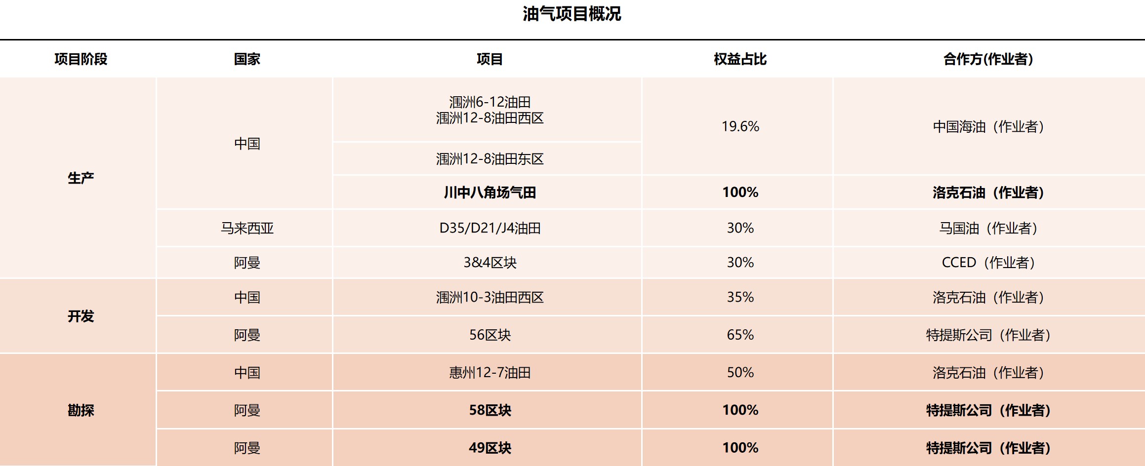 目前主要油氣項目位于中國四川、南海西部北部灣、南海東部珠江口、馬來西亞以及阿曼等地,目前日均油氣產(chǎn)量35000桶當(dāng)量。